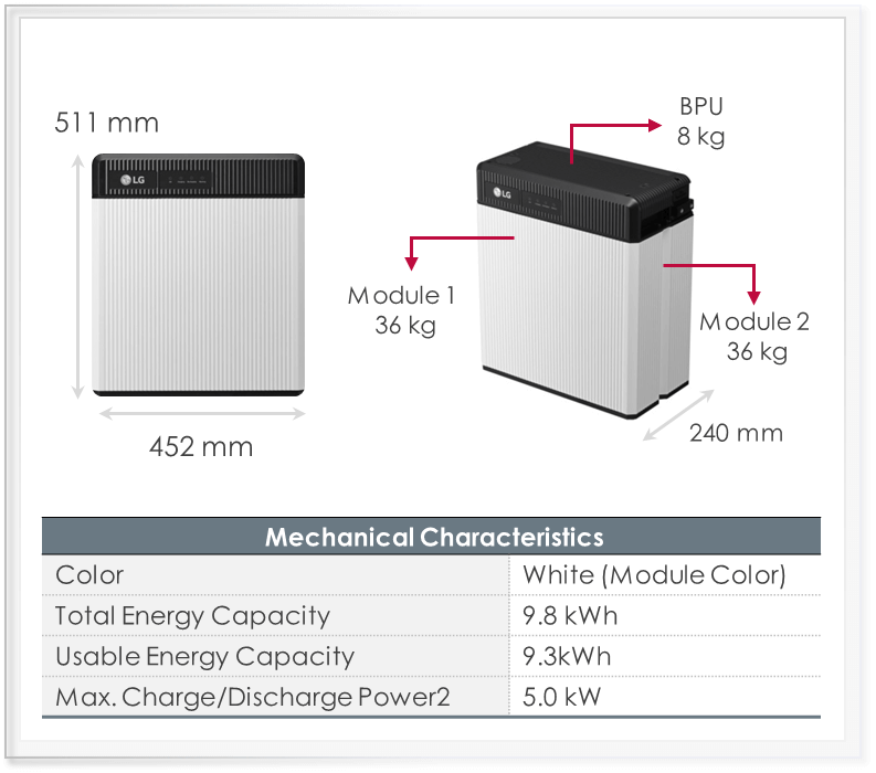 RESU10M è composto da due moduli e un BPU (Battery Protection Unit). Il modulo batteria pesa 36 kg, il peso contenuto lo rende maneggevole e leggero se confrontato con sistemi monoblocco. le sue caratteristiche di peso e ingombro lo rendono trasportabile e gestibile con facilità. Oltre ai due moduli da 36kg ciascuno, occorre tenere in considerazione la BPU che pesa solo 8kg. Anche quando tutte e tre le parti sono combinate, raggiunge solo 80kg di peso, eccezionalmente leggera per una batteria da 10kWh. In conclusione la struttura componibile ridurrà lo sforzo dell’installatore nel portarlo e posizionarlo sul posto e si potrà così risparmiare sul costo del lavoro e accorciando i tempi di installazione.