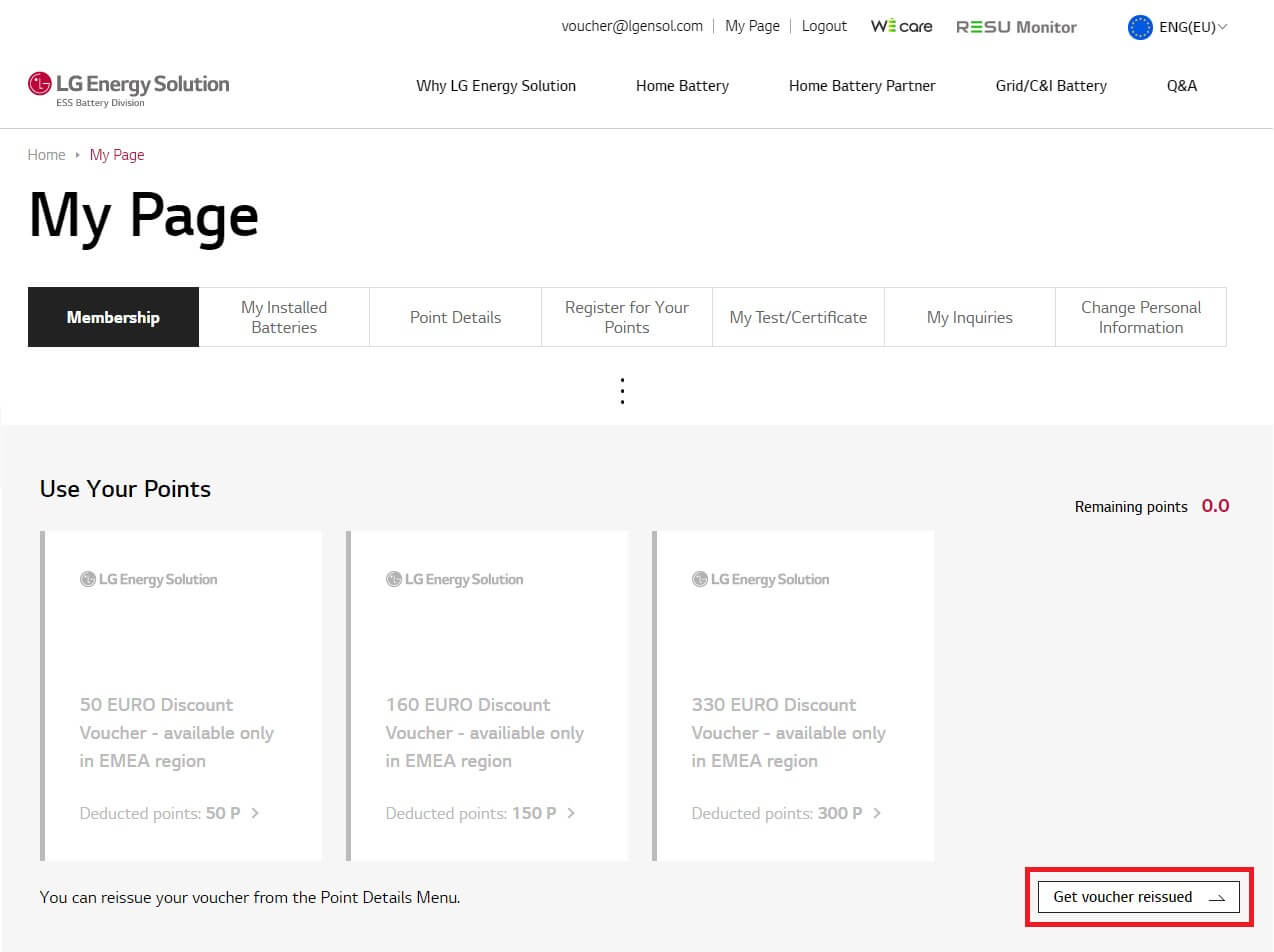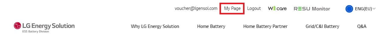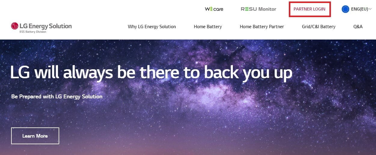 - Log in to https://www.lgessbattery.com/eu/main/main.lg by pressing ‘PARTNER LOGIN’.